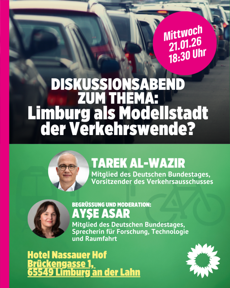 Mobilität ist mehr als Auto. Wie wird Limburg erreichbar – ohne noch mehr Asphalt? Könnte Limburg zur Modellstadt für die Verkehrswende werden? Wir wollen über konkrete Lösungen für Stadt & Landkreis diskutieren: ÖPNV, Rad, Schiene, On-Demand, Pendelverkehr.